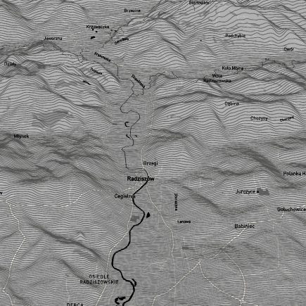 Mapa hipsometryczna Radziszowa i okolic w wersji monochromatycznej z naniesioną siatką ulic. Wygenerowane dzięki narzędziu: anvaka github io. https://anvaka.github.io/peak-map/#12.9/49.93361/19.82863/171/45 Oczywiście, prawidłowa mapa hipsometryczna przedstawia wysokości terenu za pomocą poziomic, czyli linii łączących punkty o tej samej rzędnej. W tym przypadku mamy jedynie zobrazowany, mocno uproszczony i przejaskrawiony kontur ukształtowania terenu. Warto zwrócić uwagę, że ulice …